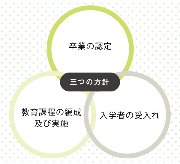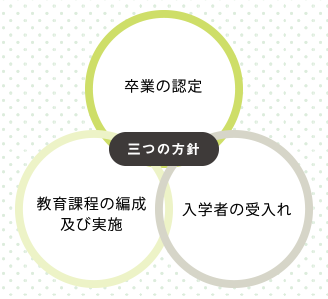 「卒業の認定に関する方針(ディプロマ・ポリシー)」「教育課程の編成及び実施に関する方針(カリキュラム・ポリシー)」「入学者の受入れに関する方針(アドミッション・ポリシー)」を紹介しています。