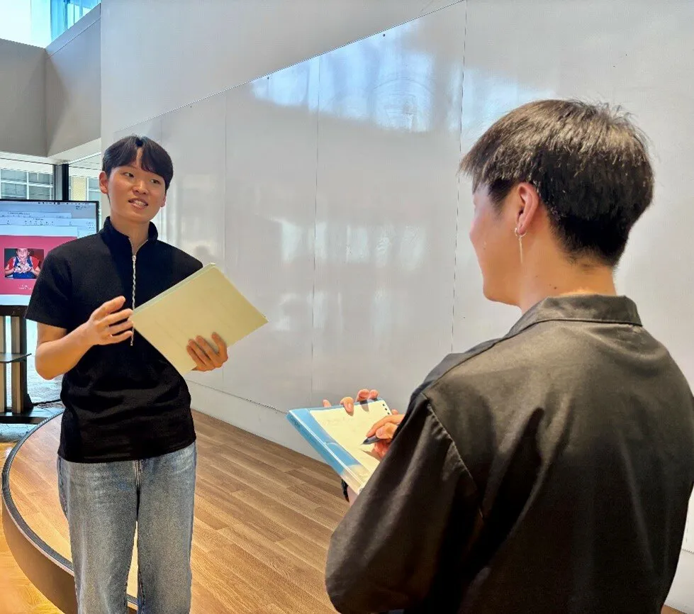 A.)言語文化学科の佐々木淳先生から推薦されて決断しました。日本での生活では英語や韓国語といった外国語に触れる機会が少ないので、今回のイベントは自分の語学力を鍛えるチャンスだと思いました。また、アーティストの方々とお話しすることで、その考え方や価値観を自分の成長の糧にしたいです。