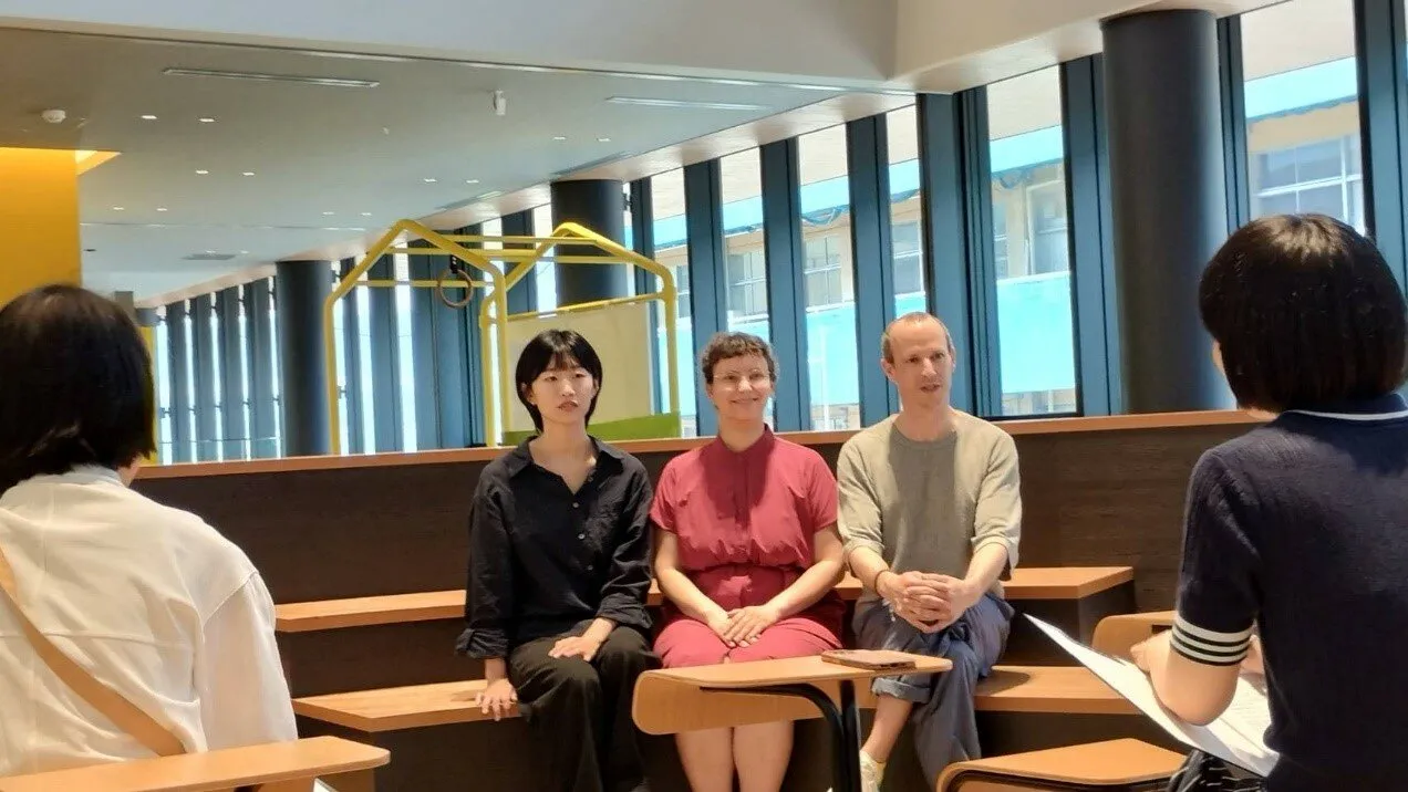 また、同日の午前には朝日新聞社の記者が来校し、アーティストの皆さんへのインタビューも行われました。「広島での滞在期間中に何をしたいか」「HASに期待していることはあるか」などの質問に、時には笑いが起こるエピソードを交えながら、それぞれの思いを語っていました。