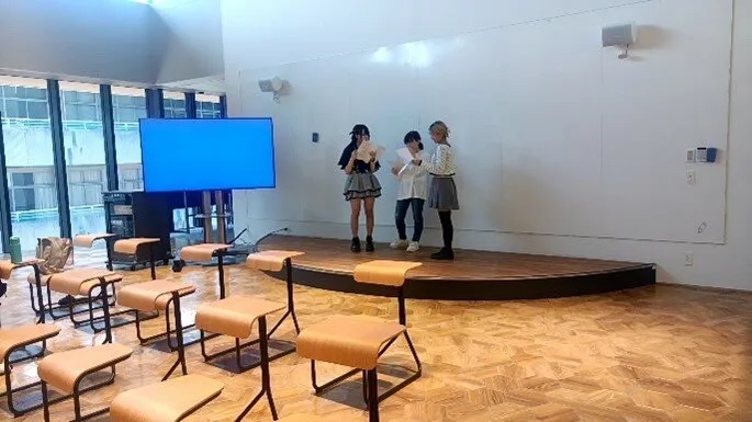 声出し練習は、3号館のプレゼンテーションコートに移動し、実際にステージに立っての「通しリハーサル」です。真剣な眼差しで行っていた個人での読みとは打って変わって、通しリハーサルではにこやかに、明るく進めていました。単に読み方が上手な人とは明らかに違い、司会やナレーションをしてきた人なのだなと感じました。