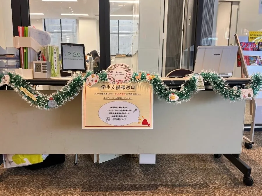 12月になったということで、クリスマスの装飾をしました。学生支援課窓口が華やかな雰囲気になりました。