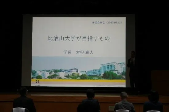 続いて、宮谷学長より『比治山大学が目指すもの』を保護者の皆様にお話しし、「学生一人ひとりに成長実感を持ってもらいたい。その為に、全ての教職員が全ての学生を教育する意識で取組み、学生が躍動するキャンパスを目指していく。」と本学の方針をご説明しました。